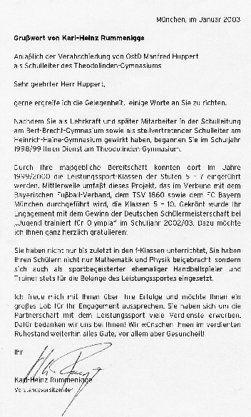 Sinne berechenbar, er stand zu seinen Anordnungen. Und er stellte sich stets vor sein Kollegium. Er war immer der Meinung, Fehler dürfe jeder machen, man müsse aber aus ihnen lernen. Das hat ihm die große Wertschätzung des Kollegiums gebracht. Am 31. Januar 2003 endete die Dienstzeit von Herrn Huppert am TLG. In einer kleinen Feierstunde verbschiedeten die Schüler/innen, der Elternbeirat und das Kollegium in Anwesenheit der Stadt-schulrätin Frau Weiß-Söllner und weiterer Honoratioren Herrn Huppert schweren | |||||||||||||